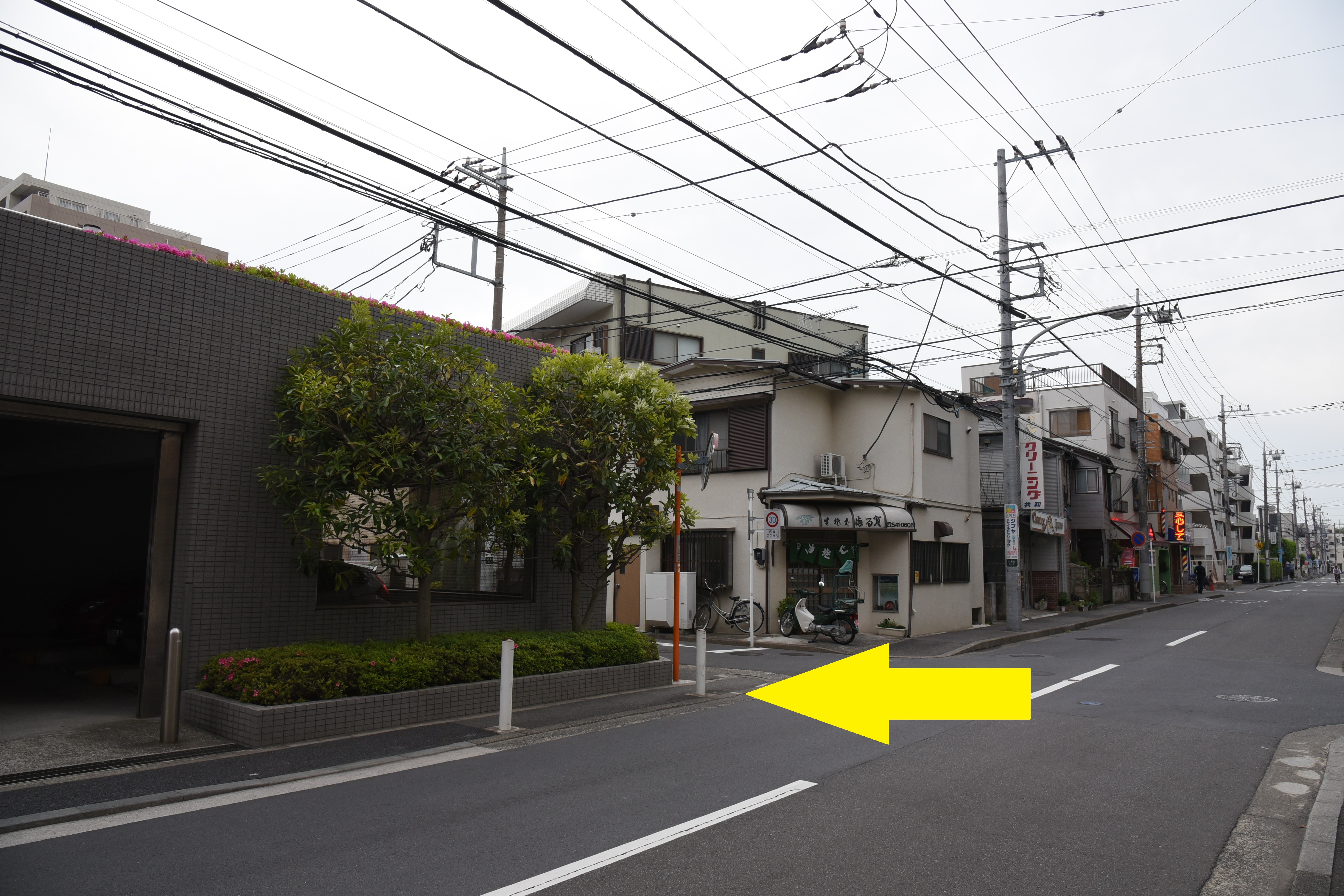 5. 角に赤いポストがある交差点を左折し、15m進みます。